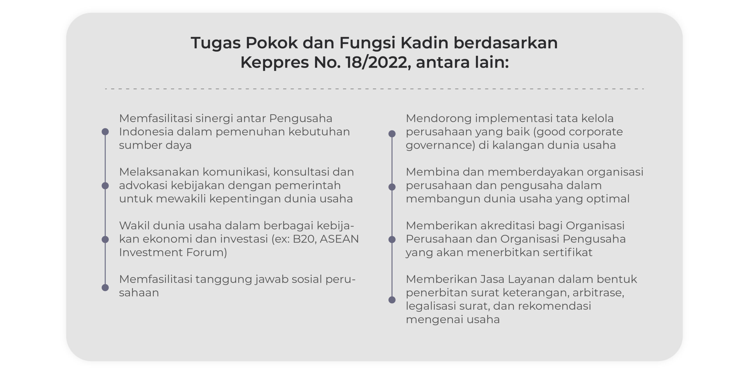 Sesuai dengan mandat Keppres No. 18/2022, Kadin Indonesia merumuskan program kerja yang berfokus pada upaya menjalankan peran strategis sebagai mitra pemerintah dalam meningkatkan perekonomian nasional.